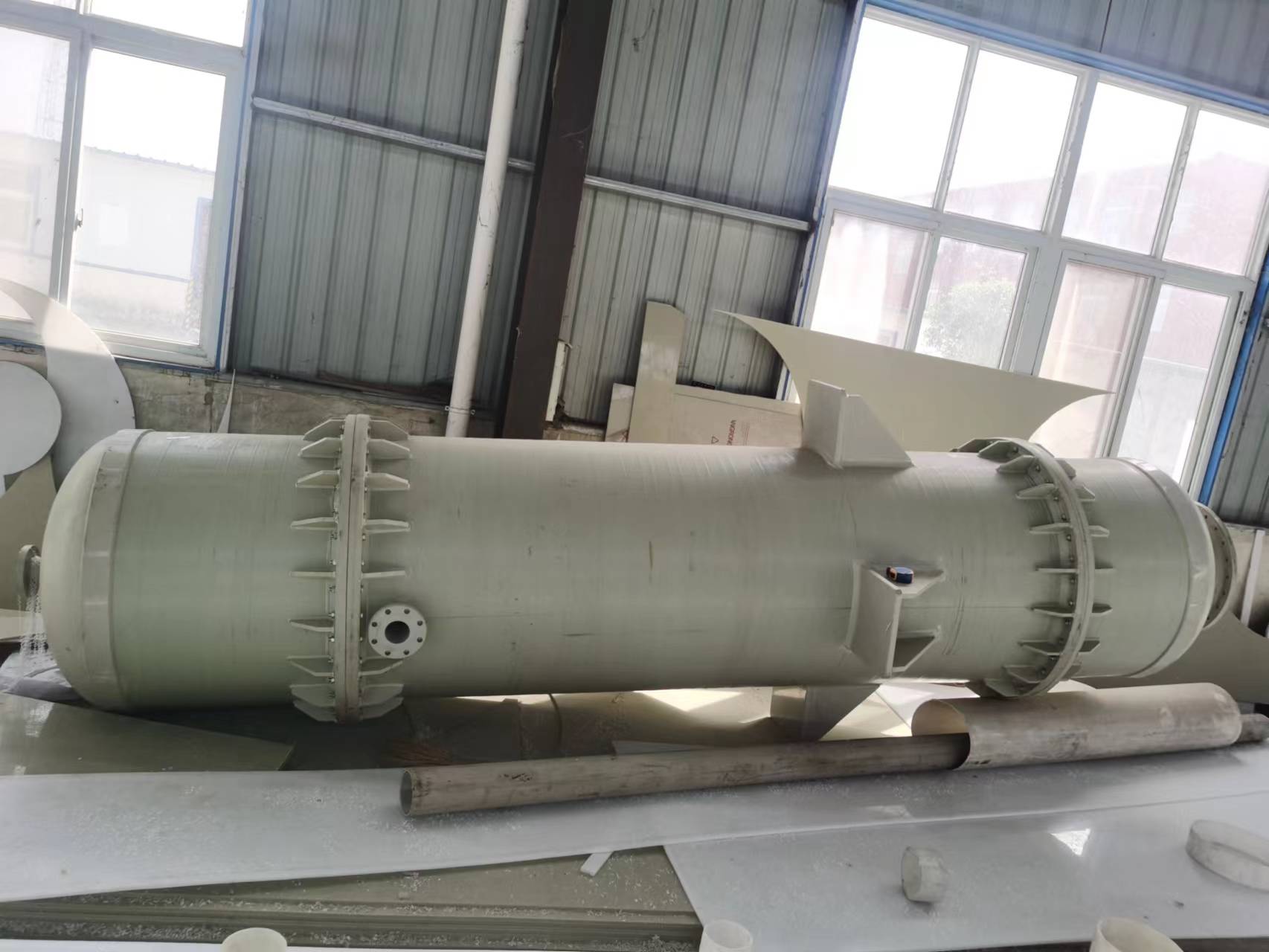 石墨改性聚丙烯降膜式吸收器是我國近期發(fā)展起來的新型吸收器。這種吸收器是屬于濕壁式表面吸收裝置。它由液體布膜段、吸收冷卻段、氣液分離段三部分組成。本設(shè)備工作時(shí)吸收劑通過布膜器垂直地沿列管內(nèi)壁以薄膜狀下降,氣體自上而下(并流)或自下而上(逆流)通過內(nèi)管空間,氣液兩相在流動(dòng)的液膜上進(jìn)行傳至反應(yīng)。列管外通冷卻水(劑)以除去吸收過程中釋放出的熱量。由于它許多性能超過石墨降膜式吸收器,因此它已廣泛代替石墨降膜式吸收器。
